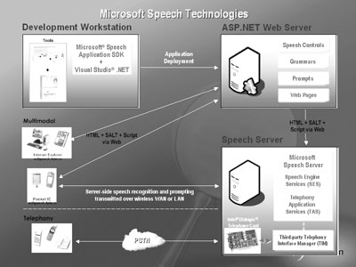 在語(yǔ)音應(yīng)用方面微軟是一個(gè)先行者,在語(yǔ)音應(yīng)用還沒有被人們所認(rèn)識(shí)的時(shí)候微軟已經(jīng)推出了自己的桌面語(yǔ)音產(chǎn)品(大家應(yīng)該都知道金山詞霸中的單詞發(fā)音,它使用的就是微軟TTS引擎)。而Speech Server 2004是微軟今年新推出的基于Web的語(yǔ)音服務(wù)器端產(chǎn)品,它主要分為兩個(gè)部分:SES(Speech Engine Services)和TAS(Telephony Application Services)。其中SES是語(yǔ)音引擎服務(wù),包括SAPI、語(yǔ)音輸入以及語(yǔ)音識(shí)別,支持話音、PPC以及桌面語(yǔ)音;TAS是電話應(yīng)用服務(wù),集成了SALT以及媒體與語(yǔ)音管理,是第三方話音界面與Speech Server的接口。
