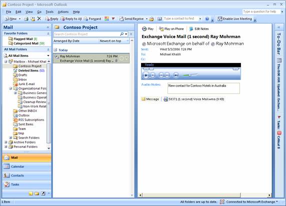 Outlook 2007,它將語音郵件作為優(yōu)先數(shù)據類型來集成。Outlook 2007 界面允許用戶連同其它數(shù)據項一起對語音郵件消息進行排序、搜索和確定其優(yōu)先級;此外,用戶可以在他們的座機上播放語音郵件消息,并向語音郵件消息添加附注,以便連同關聯(lián)的發(fā)件人和日期信息一起對消息內容建立索引。(請參見圖2)Outlook