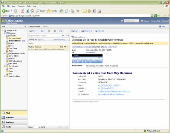 Outlook Web Access 2007,它允許用戶從瀏覽器會話中訪問語音郵件和傳真數(shù)據。OWA 2007 提供了對許多 Outlook 2007 功能的基于瀏覽器的無處不在的訪問,包括在計算機或電話機上回放語音郵件消息的能力和創(chuàng)建并收聽音頻附注的能力。(請參見圖3)