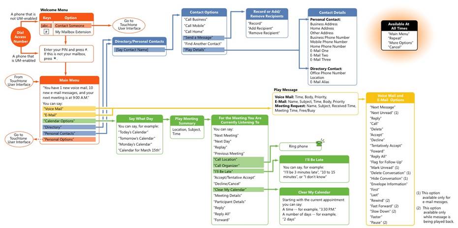 允許用戶通過電話處理他們的消息和日歷數(shù)據(包括收聽、轉發(fā)和回復電子郵件,以及發(fā)出、更新或響應會議請求)。用戶可以標記消息以便跟蹤、跳到下一封未讀郵件、隱藏或刪除對話,甚至查找來自特定用戶的消息,這一切全都使用語音導航或標準按鍵式鍵盤來完成。