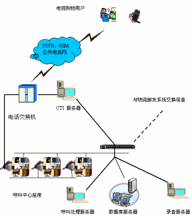 電視購物的特點是隨著電視廣告的播出,來訪電話會蜂擁而至,高峰期電話中心系統(tǒng)對大量的電話訪問采用只簡單記錄主要信息,隨后通過CALL BACK進行回訪銷售的策略,擴大銷售對象。另外電話中心系統(tǒng)對呼損電話自動生成CALL
