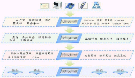證券客戶服務(wù)系統(tǒng)面向用戶提供電話、傳真、網(wǎng)絡(luò)等方式的咨詢、查詢、委托、銀行轉(zhuǎn)帳、自動業(yè)務(wù)等業(yè)務(wù)功能。系統(tǒng)以提供“個性化、社會化、信息化”服務(wù)為重要特征,具有“滿足未來業(yè)務(wù)發(fā)展需要”、“滿足實(shí)時處理”的能力。系統(tǒng)在設(shè)計(jì)、實(shí)現(xiàn)上,以具有先進(jìn)技術(shù)和高穩(wěn)定性的呼叫中心平臺為基礎(chǔ),竭力為證券業(yè)務(wù)運(yùn)營商建立一個強(qiáng)大、開放、靈活的業(yè)務(wù)服務(wù)系統(tǒng),更好地滿足證券用戶日益增長的各種新的服務(wù)需求,保持證券企業(yè)在市場競爭中的優(yōu)勢。