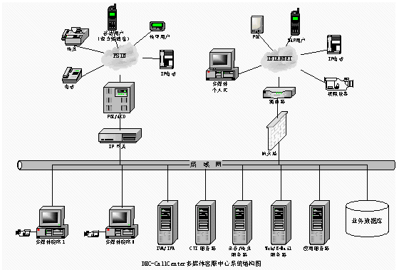 普通電話(huà)用戶(hù)通過(guò)PSTN接入DHC- UIPS綜合信息平臺(tái)系統(tǒng),接受話(huà)務(wù)員服務(wù)或自動(dòng)業(yè)務(wù)流程。傳真用戶(hù)進(jìn)入系統(tǒng)可以進(jìn)行傳真業(yè)務(wù)。計(jì)算機(jī)用戶(hù)也可以通過(guò)Internet訪問(wèn)企業(yè)客戶(hù)服務(wù)系統(tǒng)主頁(yè),獲得服務(wù)。同時(shí)計(jì)算機(jī)用戶(hù)也可以通過(guò)Internet利用網(wǎng)絡(luò)電話(huà)的功能要求話(huà)務(wù)員服務(wù)或自動(dòng)業(yè)務(wù)流程。