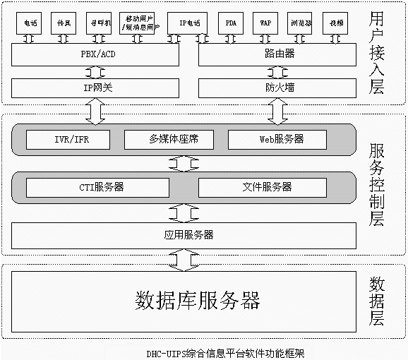 即DHC-UIPS綜合信息平臺(tái)的接入端,包括IVR流程、人工坐席等,它是用戶(hù)進(jìn)入多媒體客服中心客服系統(tǒng)的入口,它將直接面對(duì)用戶(hù)并收集各種信息。支持電話(huà)、傳真、電子郵件、WEB訪問(wèn)、WAP、PDA、IP電話(huà)、網(wǎng)絡(luò)電話(huà)、視頻電話(huà)等多種方式接入。