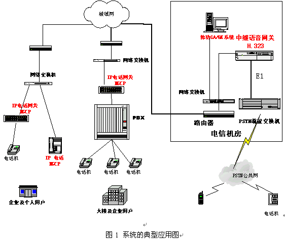系統(tǒng)的真正價值應(yīng)該在實際應(yīng)用中得以體現(xiàn)。這套系統(tǒng)的很重要的一個應(yīng)用領(lǐng)域就是VoIP接入網(wǎng)的建設(shè)。其典型的應(yīng)用如圖1所示。