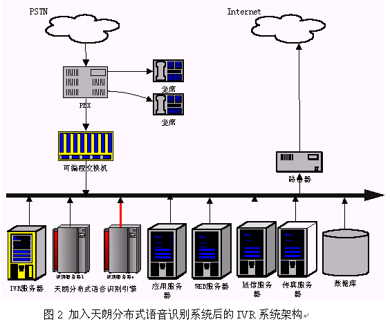 硬件連接:天朗分布式語(yǔ)音識(shí)別系統(tǒng)是通過局域網(wǎng)來把客戶端和服務(wù)器連在一起。因此在硬件上把天朗分布式語(yǔ)音識(shí)別系統(tǒng)聯(lián)入到IVR的一種簡(jiǎn)單的辦法是把引擎的所有服務(wù)器接入到系統(tǒng)現(xiàn)有的局域網(wǎng)中,使得識(shí)別服務(wù)器能和IVR服務(wù)器通過TCP/IP通訊即可。連接后的系統(tǒng)架構(gòu)可以用圖2來表示。