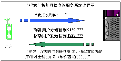 2004年4月15日和4月20日,擁有完全自主知識產權的語音與語言技術開發(fā)商和技術提供商北京得意音通技術有限責任公司(得意公司),在國際上率先把中文自然語言理解技術應用在中國聯(lián)通和中國移動短信服務平臺上,結合《精品購物指南》報社權威、全面的信息資源,開通了北京地區(qū)餐飲領域智能短信查詢服務(簡稱智能短信),并將進一步支持互聯(lián)網(wǎng)平臺和WAP平臺,陸續(xù)開通更豐富和更實用的智能信息服務。