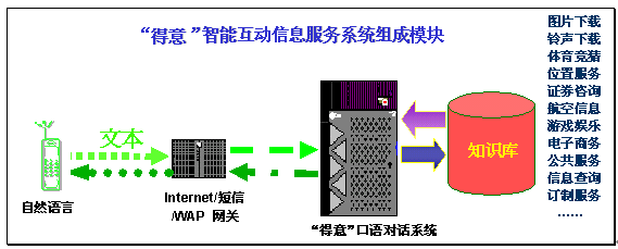 "得意"智能互動(dòng)信息服務(wù),是對(duì)用戶輸入的文本進(jìn)行自動(dòng)分析和理解,再從知識(shí)庫中提取用戶所需的信息,然后自動(dòng)產(chǎn)生智能應(yīng)答語句,并以文本的形式通過電腦或者手機(jī)發(fā)回用戶。由于"得意"口語對(duì)話系統(tǒng)具有上下文相關(guān)理解和人機(jī)混合主導(dǎo)等強(qiáng)大功能,在指定的領(lǐng)域內(nèi),用戶可通過一次或者多次輸入(包括詞語、句子)構(gòu)成一組對(duì)話,完成復(fù)雜的信息查詢或者其他互動(dòng)信息服務(wù)。