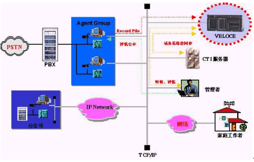 現(xiàn)在國內(nèi)市場上的絕大部分錄音設備是基于語音板卡的,而VELOCE 是通過小巧的USB錄音模塊連接到話務員PC上,利用數(shù)字語音壓縮技術(shù)和加密技術(shù)把通話內(nèi)容存儲到話務員PC, 并通過網(wǎng)絡傳輸?shù)椒⻊掌鳎?它是通過硬/軟件的錄音方式和網(wǎng)絡傳輸方式的結(jié)合體。