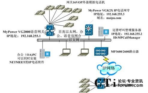 在這種應(yīng)用中,用戶通過IP網(wǎng)絡(luò)接入以太網(wǎng)IP電話機的同時,還可以在MyPower VG2000 IP語音網(wǎng)關(guān)上插入兩張16VOP IP電話模塊,接32個普通電話機。這32個電話機就像其它以太網(wǎng)IP電話機一樣可以和其它IP網(wǎng)上的IP電話機互相呼叫,此時,我們把MyPower VG2000 IP語音網(wǎng)關(guān)作為一個小型的PBX接入平臺。