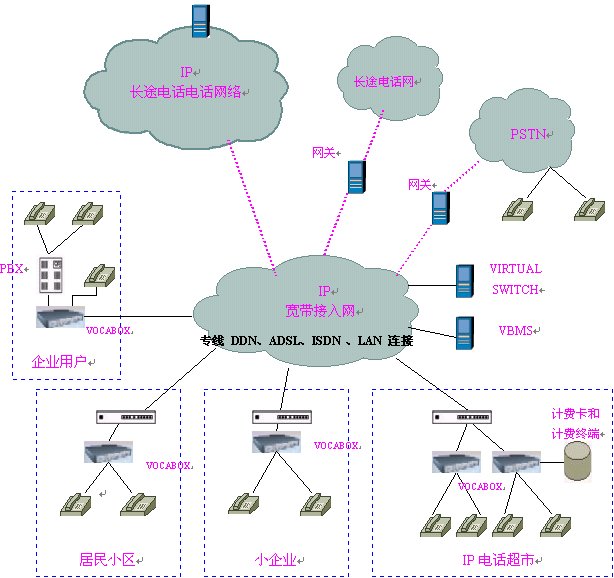 ISP及寬帶網(wǎng)絡(luò)運(yùn)營商的本地電話接入網(wǎng)絡(luò),采用單級單域結(jié)構(gòu),在網(wǎng)內(nèi)安裝VIRTUALSWITCH虛擬交換系統(tǒng),它作為整個(gè)本地電話接入網(wǎng)絡(luò)的網(wǎng)守,以集中方式管理域內(nèi)的所有網(wǎng)關(guān)(VOCA-BOX),執(zhí)行地址翻譯,呼叫控制,帶寬管理,域管理等功能以及呼叫建立、拆除控制和呼叫管理等功能。在網(wǎng)內(nèi)安裝后臺計(jì)費(fèi)、認(rèn)證系統(tǒng)(VBMS),對各個(gè)語音終端實(shí)現(xiàn)計(jì)費(fèi)認(rèn)證及結(jié)算,同時(shí)完成號碼分配及網(wǎng)絡(luò)管理的功能。