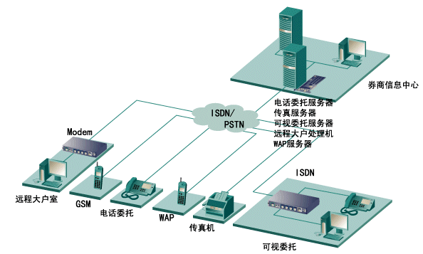 券商證券委托一般包括:電話(huà)傳真委托、可視委托(又稱(chēng)遠(yuǎn)程大戶(hù)室)和網(wǎng)上委托等。其中除網(wǎng)上委托可通過(guò)Internet網(wǎng)外,其它委托必須通過(guò)PSTN網(wǎng)來(lái)連接。在當(dāng)前階段,此類(lèi)委托占有最大的客戶(hù)群。以前,每個(gè)券商為了實(shí)現(xiàn)此類(lèi)委 托,必須在券商中心的機(jī)器上安裝語(yǔ)音卡、傳真卡、座席卡來(lái)滿(mǎn)足電話(huà)傳真委托,另外還必須在另外一臺(tái)機(jī)器上安裝多串口卡和Modem Pool與座席卡相連來(lái)滿(mǎn)足可視委托,遠(yuǎn)程大戶(hù)室等業(yè)務(wù)。此方案,用戶(hù)不僅需要購(gòu)買(mǎi)很多卡,占用很多機(jī)器插槽,而且在實(shí)現(xiàn)可視委托時(shí),只能接受客戶(hù)端PSTN模擬Modem的呼叫,而不能接收目前ISDN的連接方式,速度非常緩慢。本文主要提出了一種采用Eicon Diva Server PRI卡的新型解決方案,本方案不僅省去了在中心插上傳真卡、語(yǔ)音卡、座席卡多種卡,又省去了多串口卡和Modem Pool構(gòu)件,只需在中心的一臺(tái)機(jī)器插上1-4塊Diva Server PRI卡后,便能滿(mǎn)足你電話(huà)傳真委托、可視委托 、遠(yuǎn)程大戶(hù)室等多種業(yè)務(wù),還支持WAP呼叫,SMS短消息發(fā)送等,在可視委托和遠(yuǎn)程大戶(hù)室業(yè)務(wù)中,不僅支持PSTN Modem的模擬呼叫,也支持ISDN的數(shù)字呼叫,方案的性?xún)r(jià)比極高,方案連接圖如下圖所示: