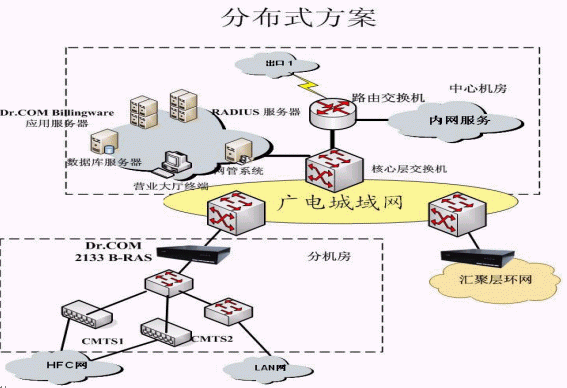 根據(jù)廣電城域網(wǎng)目前網(wǎng)絡(luò)的規(guī)模,以及以后的擴(kuò)展,采用集中接入認(rèn)證與計(jì)費(fèi),統(tǒng)一管理的方案,集中接入指:接入服務(wù)器部署在各個(gè)匯聚層的匯聚點(diǎn),即在網(wǎng)絡(luò)出口安裝寬帶接入服務(wù)器,由寬帶接入服務(wù)器對所有用戶進(jìn)行身份認(rèn)證、接入控制、實(shí)時(shí)計(jì)費(fèi)、數(shù)據(jù)采集,并將賬單和訪問日志等傳送至綜合業(yè)務(wù)系統(tǒng)。統(tǒng)一管理指在中心機(jī)房就可以進(jìn)行全部的管理,包括:網(wǎng)絡(luò)設(shè)備管理;用戶管理;經(jīng)營策略管理;賬務(wù)管理;安全管理;數(shù)據(jù)分析。提供完整的用戶資料分析,使用習(xí)慣分析,運(yùn)營統(tǒng)計(jì)等詳細(xì)分析報(bào)表。