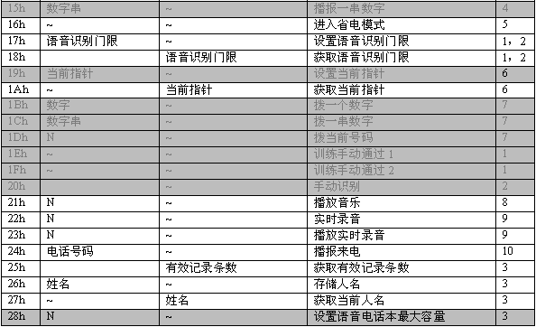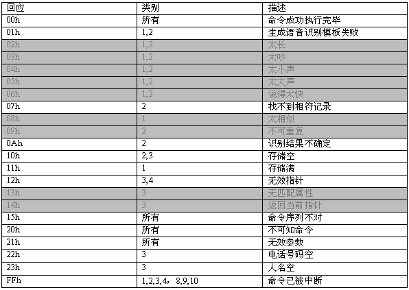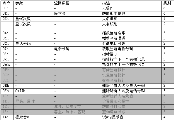 命令描述: 訓(xùn)練一個(gè)名字。當(dāng)增加一條電話本記錄時(shí),應(yīng)先執(zhí)行此命令。該命令會(huì)生成一個(gè)語(yǔ)音模板,同時(shí)產(chǎn)生一個(gè)長(zhǎng)達(dá)2秒的名字錄音。在此命令成功執(zhí)行之后,MCPU接著發(fā)送06h命令增加電話號(hào)碼。如果沒(méi)有執(zhí)行06h命令,則該項(xiàng)記錄電話號(hào)碼為空。