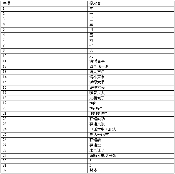 1-人名訓(xùn)練 2-人名識(shí)別 3-語(yǔ)音電話本 4-語(yǔ)音合成 5-控制功能 6-調(diào)試 7-DTMF 8-音樂(lè) 9-實(shí)時(shí)錄音/回放 10-來(lái)電播報(bào)