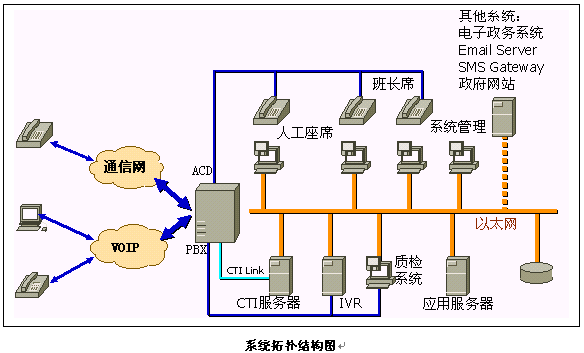 《政府呼叫中心系統(tǒng)》采用聲軟科技的《XCCP呼叫中心系統(tǒng)》平臺,主要由PBX交換機、CTI服務(wù)器、IVR系統(tǒng)、應(yīng)用服務(wù)器、數(shù)據(jù)庫服務(wù)器、TTS系統(tǒng)和座席系統(tǒng)等硬件設(shè)備和系統(tǒng)應(yīng)用軟件組成。它以電話服務(wù)為主要服務(wù)方式、結(jié)合計算機信息系統(tǒng)的資料數(shù)據(jù),為用戶提供全方位的服務(wù)。