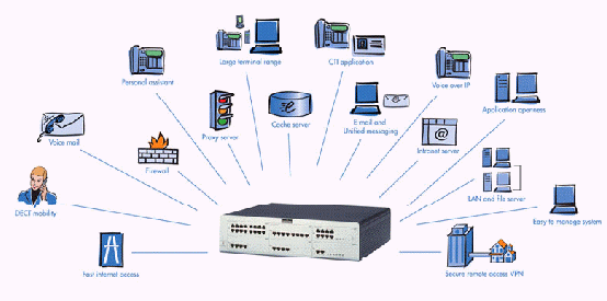 - 一體化:將多項功能集成到一個單一設(shè)備中,這些包括:因特網(wǎng)接入、E-mail服務(wù)器、局域網(wǎng)、計算機(jī)電話集成(CTI)、呼叫管理(嵌入式個人助理及語音信箱,內(nèi)部移動通信等)。