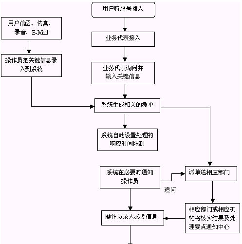人民群眾打入電話后,當(dāng)系統(tǒng)的自動語音應(yīng)答子系統(tǒng)無法解決客戶問題時,客戶可選擇人工服務(wù),由企業(yè)客戶服務(wù)代表直接接聽客戶電話,處理并解決客戶問題。此時客戶同座席話務(wù)人員直接溝通,并同時記錄下該客戶的聯(lián)系方式,將相關(guān)數(shù)據(jù)添加入系統(tǒng)數(shù)據(jù)庫;也可以在數(shù)據(jù)庫的支持下回答質(zhì)量監(jiān)督咨詢、投訴等?蛻粢部梢赃x擇自動語音服務(wù)方式,根據(jù)系統(tǒng)的語音提示輸入按鍵,選擇類別,將自己的投訴和建議以及自己的聯(lián)系方式信息以留言錄音的方式保存在系統(tǒng)中。系統(tǒng)同時還支持自動傳真方式,客戶可以通過傳真機(jī)進(jìn)入本系統(tǒng),通過按鍵選擇傳真方式,將自己的意見建議等的文本內(nèi)容傳真給系統(tǒng),系統(tǒng)自動接受并存入數(shù)據(jù)庫。