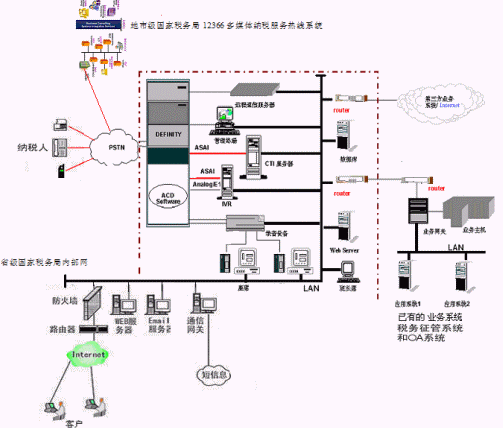 ·系統(tǒng)支持省-市-縣國家稅務局12366多媒體熱線系統(tǒng)的語音和數(shù)據(jù)聯(lián)網(wǎng); 提供完善的組網(wǎng)方案,實現(xiàn)資源共享,統(tǒng)一提供服務。