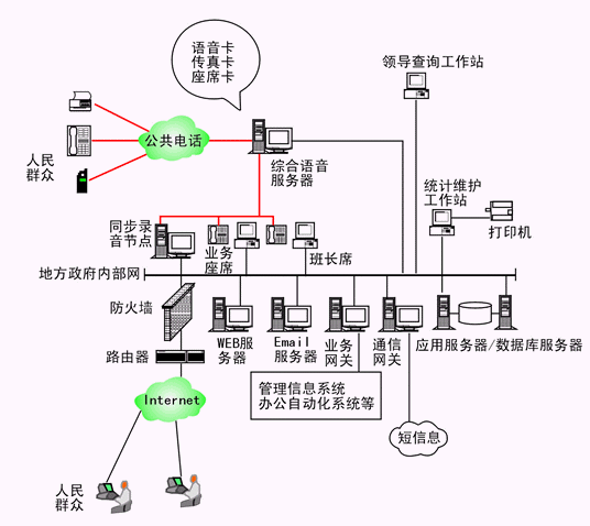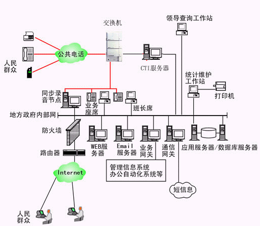 本系統(tǒng)物理結(jié)構(gòu)由帶語音板卡的工控機(jī)或排隊交換機(jī)、座席分流器、CTI服務(wù)器、IVR(交互式語音應(yīng)答)/IFR(交互式傳真應(yīng)答)服務(wù)器、業(yè)務(wù)代表座席、班長座席、統(tǒng)計維護(hù)管理工作站、因特網(wǎng)(WEB)服務(wù)器、電子郵件(EMAIL)服務(wù)器、數(shù)據(jù)庫/應(yīng)用服務(wù)器、業(yè)務(wù)網(wǎng)關(guān)服務(wù)器、錄音留言工作站、領(lǐng)導(dǎo)查詢工作站、網(wǎng)絡(luò)系統(tǒng)等構(gòu)成。