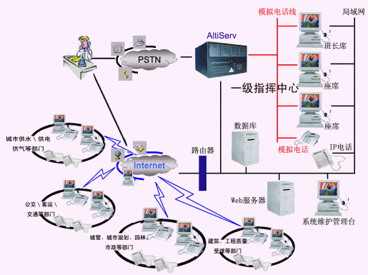 該熱線系統(tǒng)能與Internet、數(shù)據(jù)庫(kù)系統(tǒng)很好地集成,實(shí)現(xiàn)城市各級(jí)部門之間數(shù)據(jù)共享和各種其它不同的業(yè)務(wù)功能,以建設(shè)部為中心、各職能聯(lián)動(dòng)2級(jí)網(wǎng)絡(luò)系統(tǒng)和搶修維護(hù)服務(wù)端三個(gè)部分組成,利用AltiCenter基于IP的分布式呼叫中心技術(shù),可以實(shí)現(xiàn)建設(shè)部12319服務(wù)中心,屬下各個(gè)職能部門建立異地分中心,利用現(xiàn)有的PSTN電話網(wǎng)/INTERNET互聯(lián)網(wǎng),將1,2,3級(jí)網(wǎng)絡(luò)組成一個(gè)集語(yǔ)音和數(shù)據(jù)傳輸為一體的多媒體網(wǎng)絡(luò)系統(tǒng),并提供對(duì)任何方式的服務(wù)進(jìn)行全程錄音、質(zhì)檢功能,最終結(jié)果反饋到統(tǒng)一指揮服務(wù)中心。