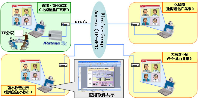 此次開始投入運行的IP電話系統(tǒng),在其總部導入了“IPstage SX”,通過沖電氣的“Com@WILL軟電話”具有的TV會議功能,能將包括總部在內(nèi)的北海道3個事業(yè)所與關東營業(yè)所進行電話聯(lián)網(wǎng)。各個事業(yè)所之間通過NTT東日本的IP-VPN服務“Flet's・Group”實現(xiàn)相互連接。