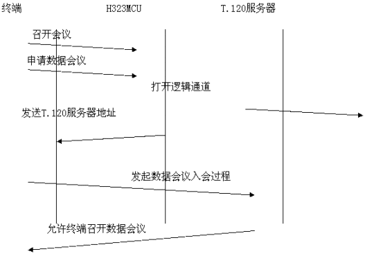 采用帶外方式,數(shù)據(jù)與音頻視頻流分開,各自占用帶寬。與終端和MCU無任何關(guān)系。如果用戶想召開數(shù)據(jù)會(huì)議,需要單獨(dú)的一臺(tái)PC機(jī)來進(jìn)行數(shù)據(jù)的接受與傳送,所有需要數(shù)據(jù)會(huì)議功能的用戶的PC機(jī)都連接到一個(gè)T.120服務(wù)器上。目前常用的終端軟件是Netmeeting軟件。數(shù)據(jù)占用單獨(dú)的帶寬,不擠占音視頻的帶寬。會(huì)議建立過程為: