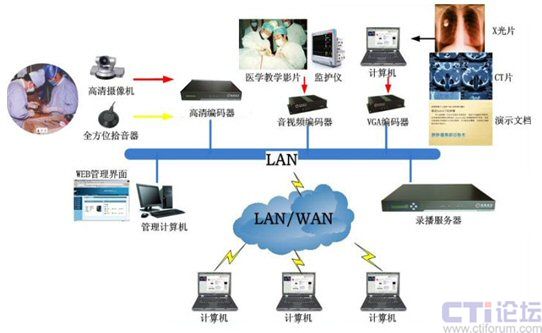 同時,銳取多媒體系統(tǒng)前端VGA編碼器將采集到的計算機信號(包含通過網(wǎng)絡(luò)訪問的DR/CR片、CT片)進行實時編碼和壓縮,通過網(wǎng)絡(luò)與高清視音頻信號以及普通視音頻信號同步傳輸?shù)戒J取多媒體錄播系統(tǒng)遠(yuǎn)程醫(yī)療系統(tǒng)后臺服務(wù)器上。
