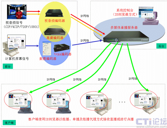 可通過單播或組播方式將會議現(xiàn)場的視頻、音頻、計算機(jī)動態(tài)屏幕在網(wǎng)絡(luò)上進(jìn)行實時直播,用戶可通過IE瀏覽器登錄服務(wù)器實時接收直播的視頻、音頻和計算機(jī)動態(tài)屏幕內(nèi)容。系統(tǒng)獨家支持組播代理功能,無須更改網(wǎng)絡(luò)設(shè)備的設(shè)置即可實現(xiàn)跨網(wǎng)段的組播。系統(tǒng)獨家支持文件組播功能,可將錄制好的文件在網(wǎng)絡(luò)上再次進(jìn)行組播。