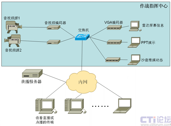 圖2所示的錄播系統(tǒng)可以同步錄制2路音視頻信號和3路電腦屏幕信號。音視頻信號可以是對抗雙方的實時畫面,而電腦屏幕信號則可以是指揮中心里的各種指揮輔助系統(tǒng)的顯示,如雷達(dá)屏幕信息、沙盤推演動態(tài)、作戰(zhàn)計劃以及戰(zhàn)情匯報的ppt演示,所有這些內(nèi)容都可以非常方便地同步錄制下來。內(nèi)網(wǎng)里的所有有權(quán)限的人員都可以實時收看這些內(nèi)容,同時,這些存儲下來的內(nèi)容也可以進(jìn)行事后點播,用于分析、講評。