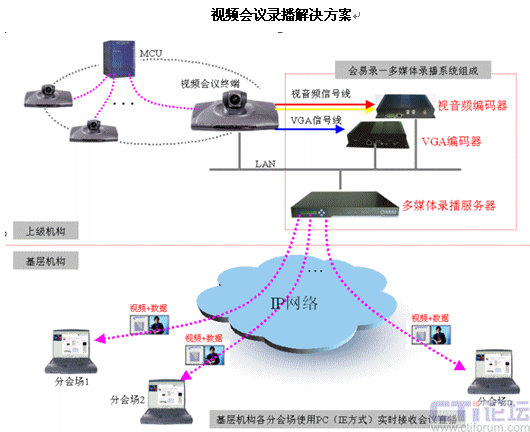 如圖所示,上級(jí)機(jī)構(gòu)視音頻編碼器接在視音頻源上,對(duì)視音頻信號(hào)采集,VGA編碼器采集VGA信號(hào),通過(guò)網(wǎng)絡(luò)傳給放在機(jī)房的多媒體錄播服務(wù)器;鶎訖C(jī)構(gòu)的各個(gè)分會(huì)場(chǎng)通過(guò)IE瀏覽器的方式接受會(huì)議直播。