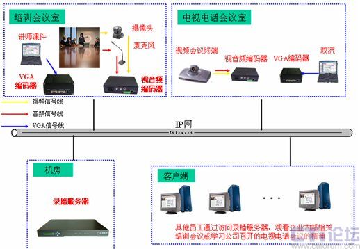 由于視頻會議系統(tǒng)沒有覆蓋公司內(nèi)所有的會議室,因此這些會議室召開的會議就無法進(jìn)行直播,而借助于多媒體錄播系統(tǒng)就可以很好的解決這一缺陷。通常將這些會議室中的攝像頭和麥克風(fēng)接入到視音頻編碼器上,將講師電腦上的培訓(xùn)課件(如PPT,Word等文檔)內(nèi)容接入到VGA編碼器上,兩者將采集到的信號通過網(wǎng)絡(luò)發(fā)給錄播服務(wù)器,由錄播服務(wù)器進(jìn)行處理后直播到各個(gè)客戶端,就可以很方面的對于任意一個(gè)會議室召開的會議進(jìn)行錄播,隨時(shí)隨地對員工傳達(dá)會議精神。