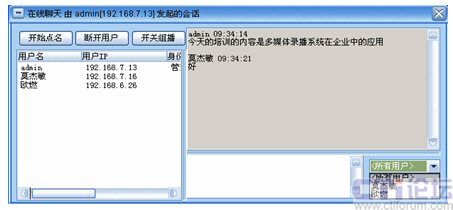 系統(tǒng)增加了多方文字互動聊天功能,在線聊天功能可以選擇給所有人員發(fā)送消息,也可以選擇給某一特定人員發(fā)送。這樣在會議或培訓(xùn)的過程中,管理員可以選擇性的提出相應(yīng)的問題給相關(guān)人員,考核相關(guān)人員的培訓(xùn)效果;其他人員也可以將會議或培訓(xùn)過程中遇到的疑問、難點(diǎn)及時(shí)的反應(yīng)給管理員進(jìn)行解答,增強(qiáng)會議的成效。