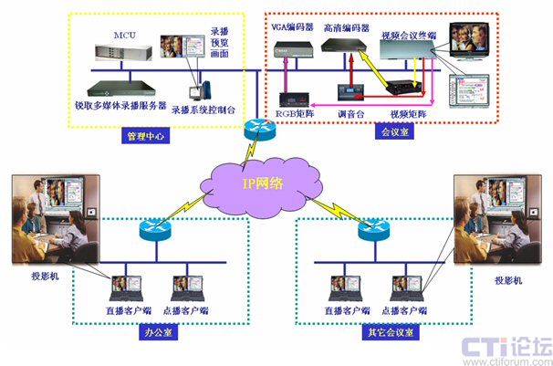 如圖所示:多媒體錄播服務器放置在管理中心,高清編碼器(采集高清視頻及聲音)及VGA編碼器(采集雙流信號)放置在會議室,客戶端可以是網絡內的任意一臺計算機。整個系統(tǒng)簡單明了,分布靈活,部署簡單,系統(tǒng)只要連接了信號線,配置了IP地址即可投入使用,無須專業(yè)布線。各部分配置如下: