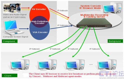 Encoder可用于采集高清視頻的信號(hào)或者VGA的信號(hào)。前臺(tái)的編碼器編碼好通過IP網(wǎng)絡(luò)傳送到服務(wù)器Multimedia