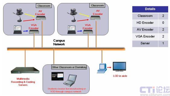如上圖所示,服務(wù)器型號(hào)為DSS-R-T2,T系列的產(chǎn)品是銳取公司專門應(yīng)用于教育行業(yè)的產(chǎn)品。T2可支持兩個(gè)教室的同時(shí)錄制與直播,放置在學(xué)校數(shù)據(jù)中心的機(jī)房中。兩個(gè)AV Encoder和兩個(gè)VGA Encoder分別放置在需要做錄制直播的教室中。學(xué)生通過校園網(wǎng)或者Internet連接到服務(wù)器即可收看多媒體教學(xué)的直播,包括老師的圖像聲音以及講解的課件內(nèi)容。在教學(xué)樓中,每一層的走廊里都安裝了大的LCD顯示屏,服務(wù)器上的多媒體內(nèi)容也將同時(shí)傳到這些顯示屏上。