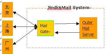 如果選用Jindi?Mail作為外部郵件服務器,可以在同一臺外部郵件服務器上配置可選的MailGate模塊,該模塊可以將指定域用戶的郵件進行定向投遞,而不依賴DNS的配置。內部郵件通過內部DNS在郵件網(wǎng)關處進行存儲轉發(fā)到外部。