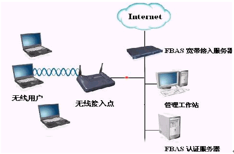 移動(dòng)用戶通過自身的無線網(wǎng)卡傳遞信息到熱點(diǎn)接收器上,熱點(diǎn)接收器連接到交換機(jī)(是為了能具有更好的可拓展性),交換機(jī)連接到華夏科技FutureWorks寬帶計(jì)費(fèi)系統(tǒng)的FBAS接入服務(wù)器上,通過接入服務(wù)器連接到INTERNET.這里的FBAS3000系列的寬帶接入服務(wù)器采用的是一體機(jī)的模式,接入,認(rèn)證,計(jì)費(fèi)等一系列服務(wù)均安裝在FBAS里,這樣可以簡(jiǎn)化網(wǎng)絡(luò)結(jié)構(gòu)。對(duì)FBAS的操作是通過WEB頁面來進(jìn)行設(shè)置維護(hù)的,