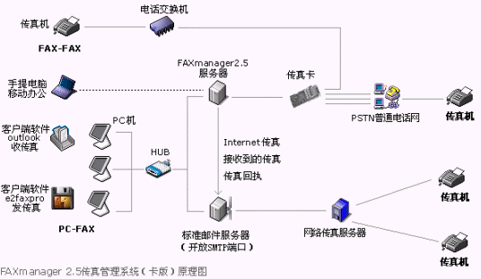 FAXmanager 2.5傳真管理系統(tǒng)安裝在局域網(wǎng)的一臺(tái)專(zhuān)用服務(wù)器上,運(yùn)行環(huán)境可以是:Windows98/NT/2000/XP等,此服務(wù)器可以同郵件服務(wù)器為同一臺(tái)機(jī)器,構(gòu)成企業(yè)郵件/傳真專(zhuān)用服務(wù)器,F(xiàn)AXmanager 2.5可以和企業(yè)郵件系統(tǒng)或群件系統(tǒng)整合使用,可以是Unix/Linux環(huán)境的Qmail和Sendmail等郵件系統(tǒng),也可以是Microsoft Exchange和Lotus Domino/Notes等群件系統(tǒng),當(dāng)然也可以是IComMail等企業(yè)郵件系統(tǒng),也支持虛擬主機(jī)設(shè)置企業(yè)郵局開(kāi)設(shè)POP3帳戶(hù)和上網(wǎng)代理服務(wù)器的使用環(huán)境。
