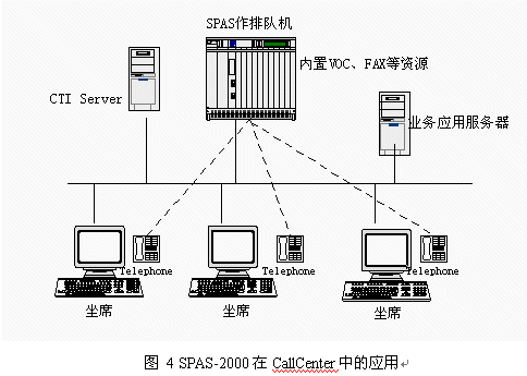 目前國內(nèi)呼叫中心的建設(shè)方興未艾,企業(yè)為了改善服務(wù),贏得客戶,紛紛建設(shè)自身的呼叫中心。如果建立呼叫中心全部采用國外設(shè)備,價格非常昂貴,使很多客戶望而卻步。這樣大的投資目前也只有電信(包括移動和聯(lián)通)、電力、銀行等資金充裕的行業(yè)才能承受。而且,根據(jù)我方了解,即使這些行業(yè)也在控制采購成本,原先只注重名牌,不計(jì)成本的情況正在改變。而在目前宏觀經(jīng)濟(jì)形勢不景氣的大背景下,大中型企業(yè)既要加快企業(yè)信息化建設(shè),保住客戶,降低成本,又要精打細(xì)算,規(guī)避投資風(fēng)險。我們掌握建立呼叫中心設(shè)備的所有核心技術(shù),因此在呼叫中心應(yīng)用方面有很大的價格優(yōu)勢,這樣就降低了擁有呼叫中心的門檻,在這個市場上也有很強(qiáng)的競爭力。采用SPAS-2000可編程交換機(jī)支持智能業(yè)務(wù)通用編程接口,可以作為CallCenter核心設(shè)備,應(yīng)用圖見圖4: