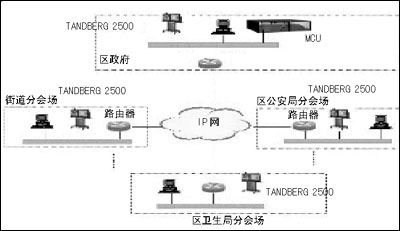 此次應(yīng)用的視頻會(huì)議終端位于東城區(qū)政府所轄范圍內(nèi)的各重要單位,通過H.323網(wǎng)絡(luò)召開內(nèi)部工作會(huì)議,從而方便地實(shí)現(xiàn)實(shí)時(shí)交互式遠(yuǎn)程會(huì)議,會(huì)議電視系統(tǒng)設(shè)計(jì)使用速率支持1.5Mbps,控制方式采用全網(wǎng)星型集中式控制方式。