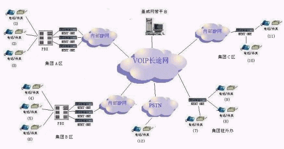 深圳市蓋威科技有限公司完整的語(yǔ)音解決方案如下,用一個(gè)網(wǎng)管平臺(tái)(AVS SERVER)來(lái)管理眾多企業(yè),各企業(yè)分支機(jī)構(gòu)間可以實(shí)現(xiàn)相互通話免話費(fèi),另外將企業(yè)內(nèi)部通話之外的電話通過網(wǎng)管平臺(tái)接入到電信營(yíng)運(yùn)商的VoIP