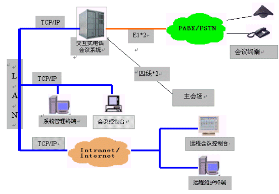 MCU-NT/I交互式電話會議系統(tǒng)為會議用戶提供了強大靈活的會議功能和豐富完善的網(wǎng)管功能。會議功能是在會議終端(或話機)和會議控制臺上實現(xiàn)的;網(wǎng)管功能是在系統(tǒng)維護終端上實現(xiàn)的,并在靈活的組網(wǎng)方式中體現(xiàn)出它的方便易用。系統(tǒng)可以外接多個會議控制臺及多個系統(tǒng)維護終端,并且可以通過企業(yè)網(wǎng)或互聯(lián)網(wǎng)的遠程連接,因此,所有功能都是可以遠程實現(xiàn)的。