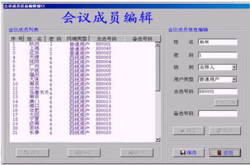 ·成員編輯:即設置會議成員數(shù)據(jù)。進行會議操作之前必須先設置會議成員數(shù)據(jù)。會議成員數(shù)據(jù)包括:人員姓名、常用號碼、備用號碼、密碼、級別(會議主持人、發(fā)言人、聽眾)。會議主持人一個,會議成員個數(shù)不限,但總數(shù)不超過180個。