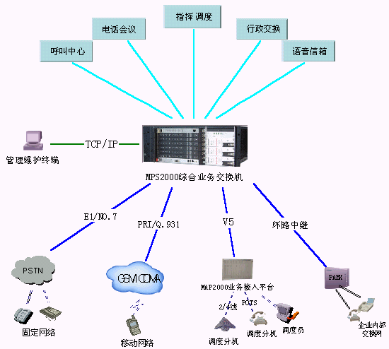同時MPS2000綜合業(yè)務交換機能支持NO.7、NO.1、Q.931等在網(wǎng)運行的所有信令協(xié)議。