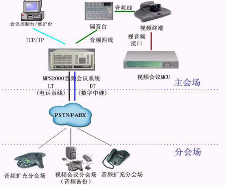 - MPS2000音頻會(huì)議系統(tǒng)通過音頻四線接口與主會(huì)場(chǎng)調(diào)音臺(tái)相連,保證視頻MCU中的音頻與音頻會(huì)議系統(tǒng)中的音頻互通。