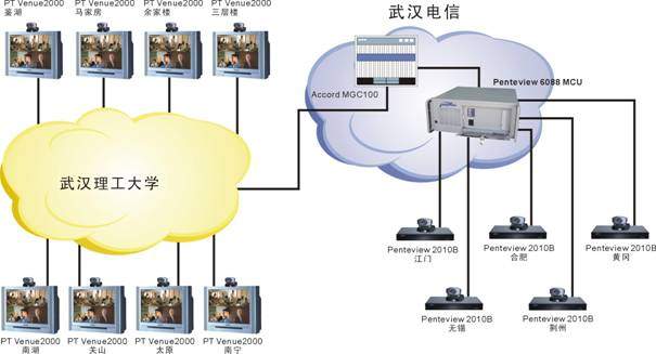 武漢理工大學(xué)的遠(yuǎn)程教學(xué)系統(tǒng)由于分3期建設(shè),網(wǎng)絡(luò)條件較為復(fù)雜。一期主要以PT的Venue2000終端+Accord MGC100 MCU為主,是一個H323系統(tǒng);二、三期采用中太多媒體的Penteview2010終端+Penteview6088MCU,是一個H320系統(tǒng),兩套系統(tǒng)通過網(wǎng)關(guān)無縫結(jié)合到一起工作,用戶根本感覺不到不同。各教室均同時采用了中太多媒體的遠(yuǎn)程教學(xué)支撐系統(tǒng),通過對Penteview會議電視系統(tǒng)的擴充,實現(xiàn)了以下功能,使教學(xué)應(yīng)用更加方便: