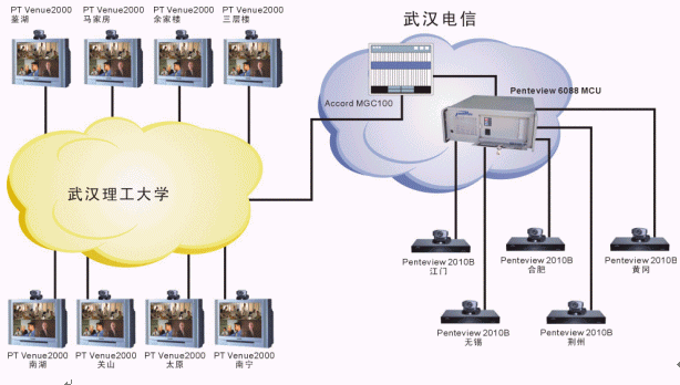 武漢理工大學(xué)的遠(yuǎn)程教學(xué)系統(tǒng)由于分3期建設(shè),網(wǎng)絡(luò)條件較為復(fù)雜。一期主要以PT的Venue2000終端+Accord MGC100 MCU為主,是一個(gè)H323系統(tǒng);二、三期采用中太多媒體的Penteview2010終端+Penteview6088MCU,是一個(gè)H320系統(tǒng),兩套系統(tǒng)通過(guò)網(wǎng)關(guān)無(wú)縫結(jié)合到一起工作,用戶(hù)根本感覺(jué)不到不同。各教室均同時(shí)采用了中太多媒體的遠(yuǎn)程教學(xué)支撐系統(tǒng),通過(guò)對(duì)Penteview會(huì)議電視系統(tǒng)的擴(kuò)充,實(shí)現(xiàn)了以下功能,使教學(xué)應(yīng)用更加方便:
