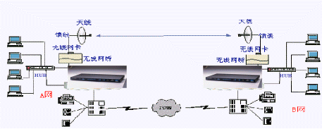 A網(wǎng)與B網(wǎng)分別為兩個(gè)局域網(wǎng),通過兩臺WavePoint II無線網(wǎng)橋?qū)蓚(gè)局域網(wǎng)連在一起,網(wǎng)橋上的RJ45口或BNC細(xì)纜接口與局域網(wǎng)相連。每臺網(wǎng)橋上插有一塊WaveLAN無線PC卡,PC卡的射頻輸出端口,通過饋線接到天線,通過PC卡來完成無線鏈路的連通。無線網(wǎng)橋連接完成后的效果類似HUB級連。IP語音網(wǎng)關(guān)-HGW-904的局域網(wǎng)接口(RJ45)連接到局域網(wǎng)的HUB上,根據(jù)用戶實(shí)際的話務(wù)量,選用Line端口接入用戶電話交換機(jī)(PBX),PBX接普通電話機(jī)和傳真機(jī),并連接至電話公網(wǎng)(PSTN)。其中所需設(shè)備:HGW-904