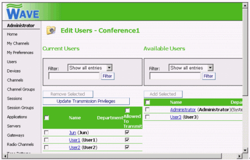 WAVE的使用方式為:管理員在服務(wù)器端建立IP電話會(huì)議,參加者使用本地計(jì)算機(jī)作為客戶端,通過耳機(jī)和麥克風(fēng)即可加入會(huì)議。一臺(tái)普通的奔四PC機(jī)可以支持?jǐn)?shù)千個(gè)會(huì)議,每個(gè)會(huì)議也允許數(shù)百個(gè)用戶參加。管理員可以分配用戶不同的權(quán)利:如講話,主持會(huì)議等等。